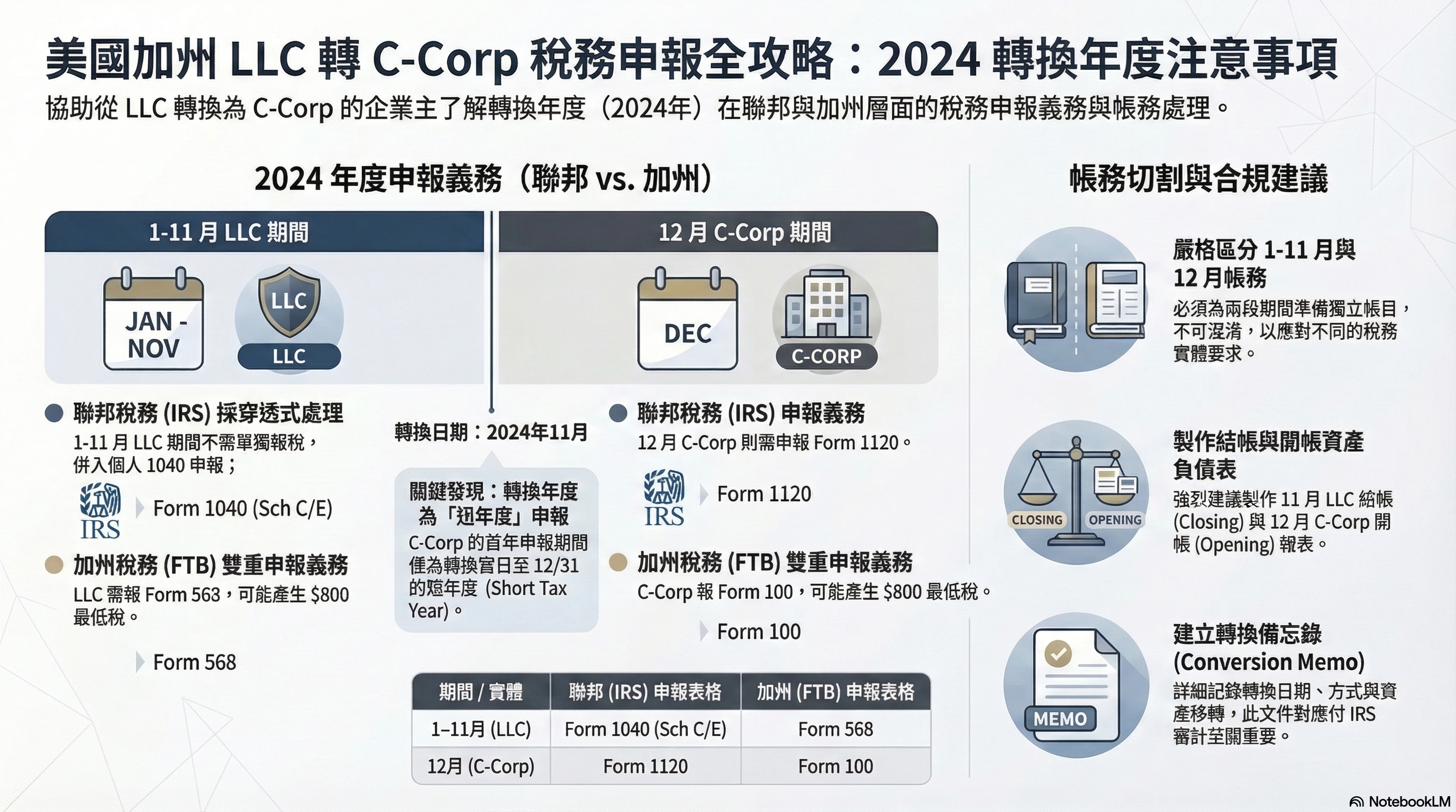CA LLC → C-Corp conversion 稅務流程圖(含 §351 / CA 568 / 1120)和 1040(Schedule C / E)