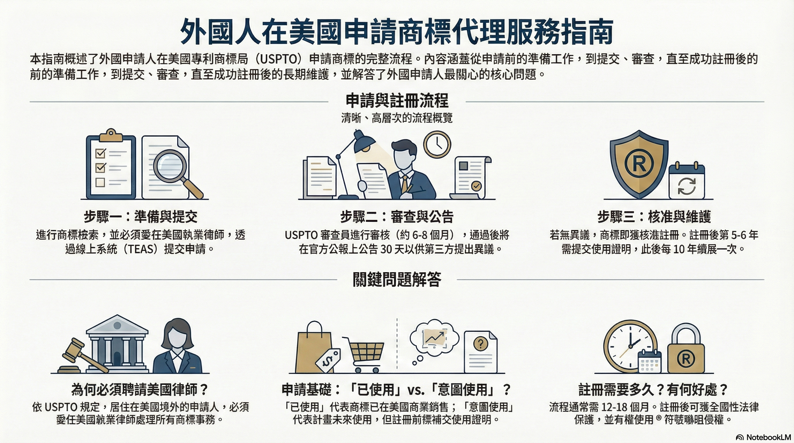 - 由於美國商標法規複雜,加上美國專利商標局審查官員態度嚴謹,外國申請人必須委託美國執業律師,作為其在美國處理所有商標事務的代表,以確保符合所有法律程序。